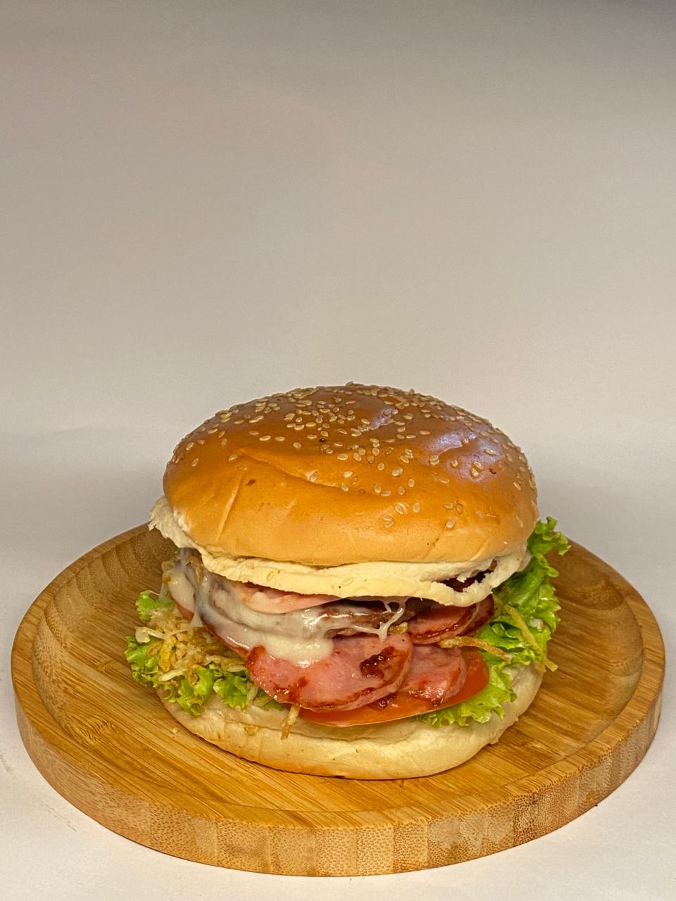 Pão, Requeijão Cremoso, Alface, Tomate, Milho, Batata Palha, Presunto, Queijo, Ovo, Hambúrguer PRENSADO PERFEITO